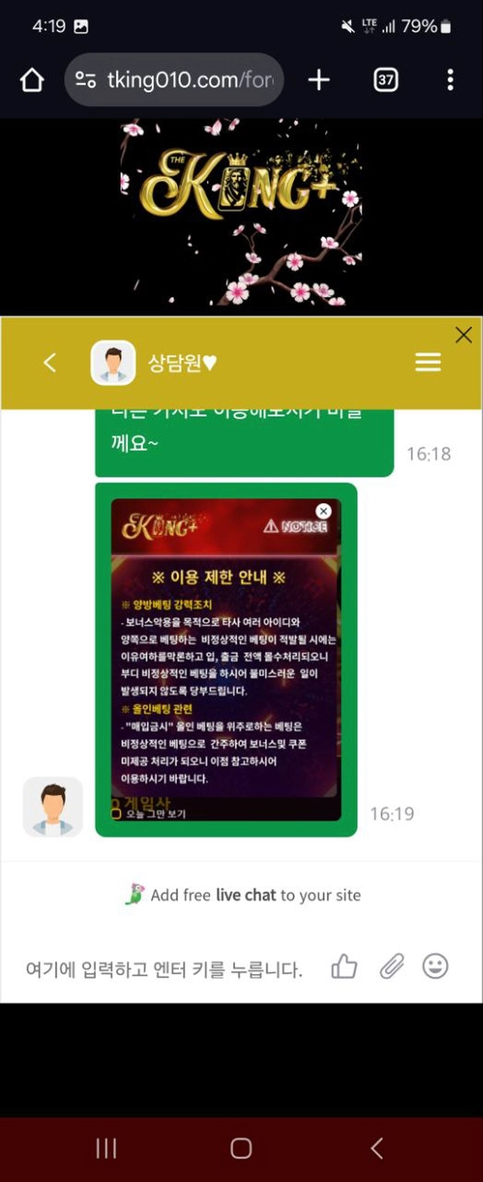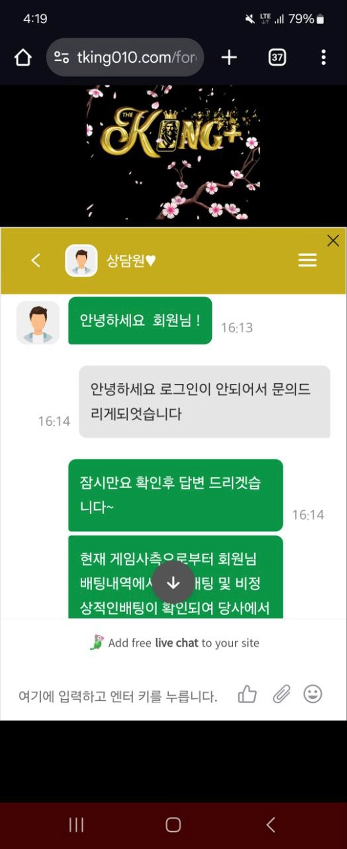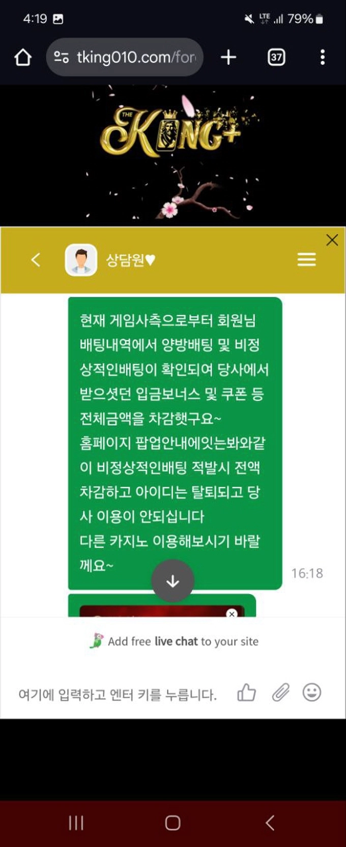 불안한 마음에 홈페이지 고객센터 라이브 채팅으로 문의했더니 ‘비정상적인 배팅’이라는 이유로 전액 차감