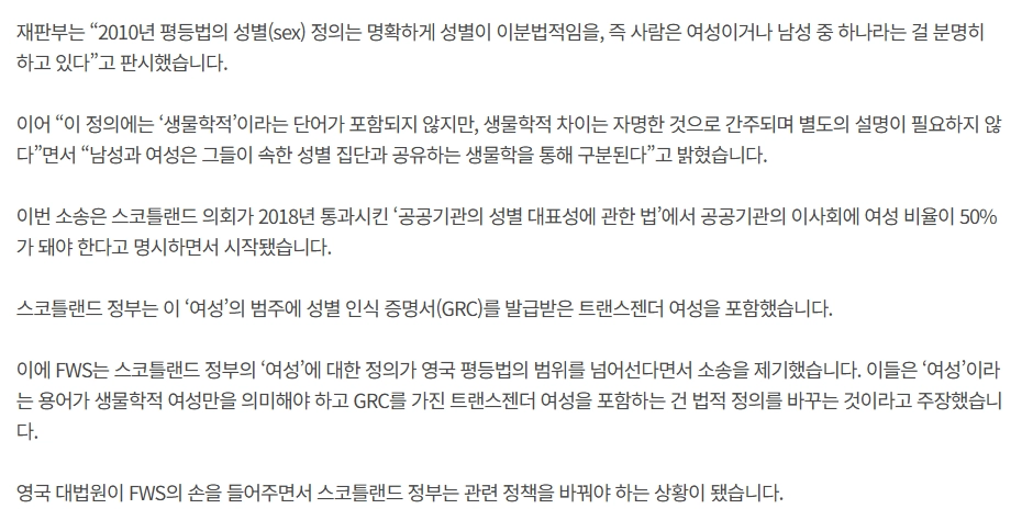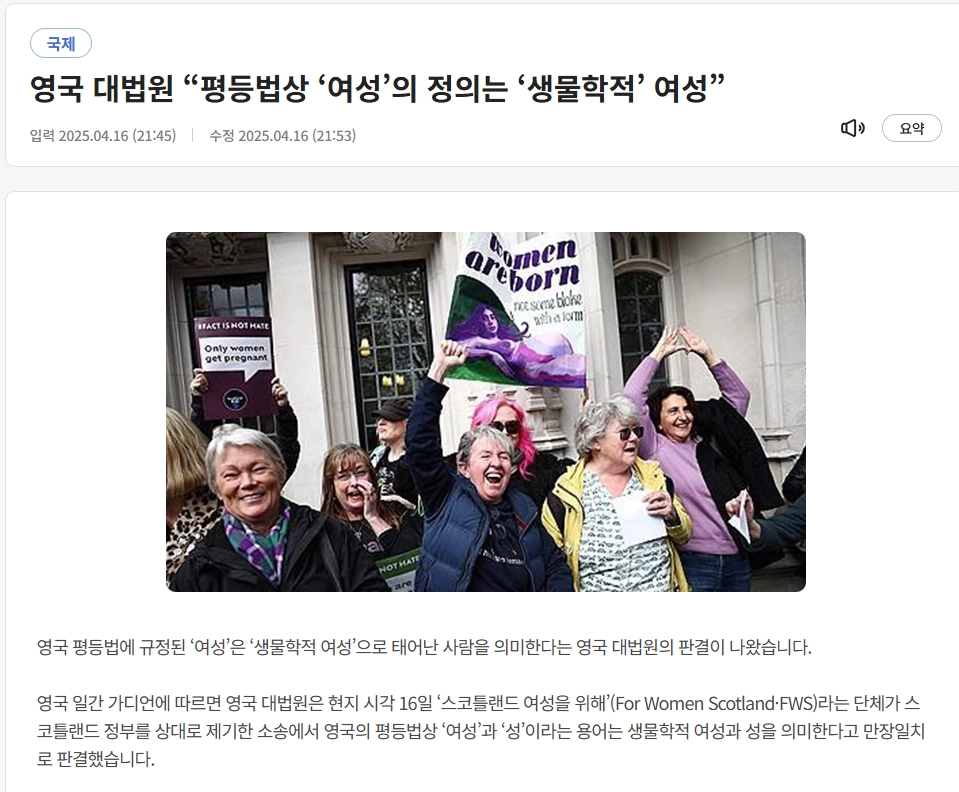 영국 대법원 “트랜스젠더 평등법상 여성 아냐” 법적 정의 선 그었다